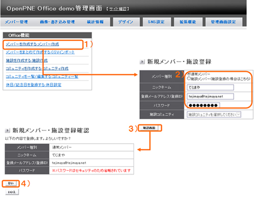 「メンバーを作成する:メンバー作成」をクリックします - 2.「通常メンバー」を選択し、「ニックネーム」、「登録メールアドレス(登録ID)」、